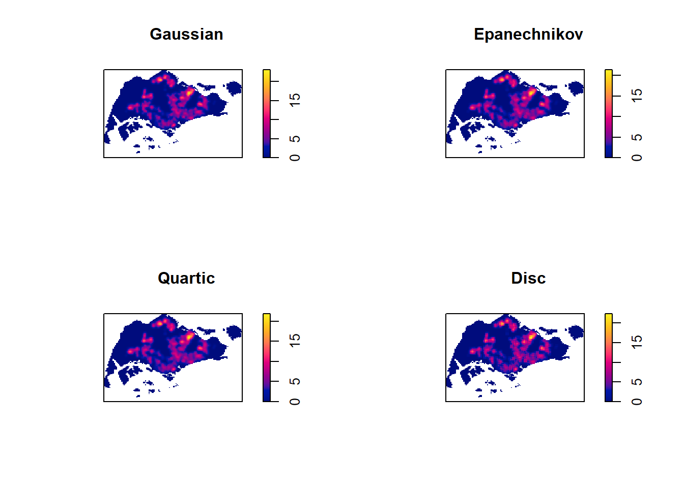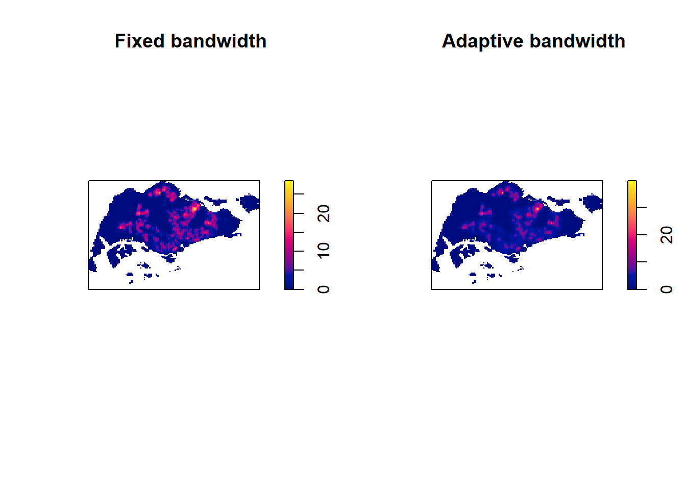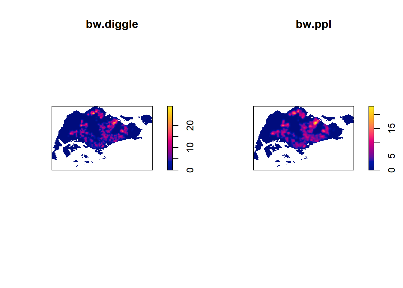 The code chunk below will be used to compute the KDE of these four planning area. bw.diggle method is used to derive the bandwidth of each