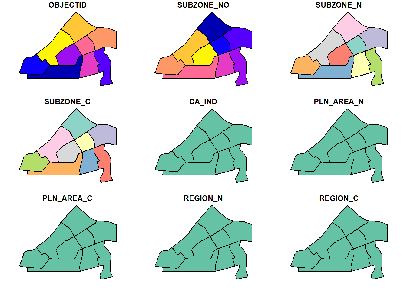 names : OBJECTID, SUBZONE_NO, SUBZONE_N, SUBZONE_C, CA_IND, PLN_AREA_N, PLN_AREA_C, REGION_N, REGION_C, INC_CRC, FMEL_UPD_D, X_ADDR, Y_ADDR, SHAPE_Leng, SHAPE_Area