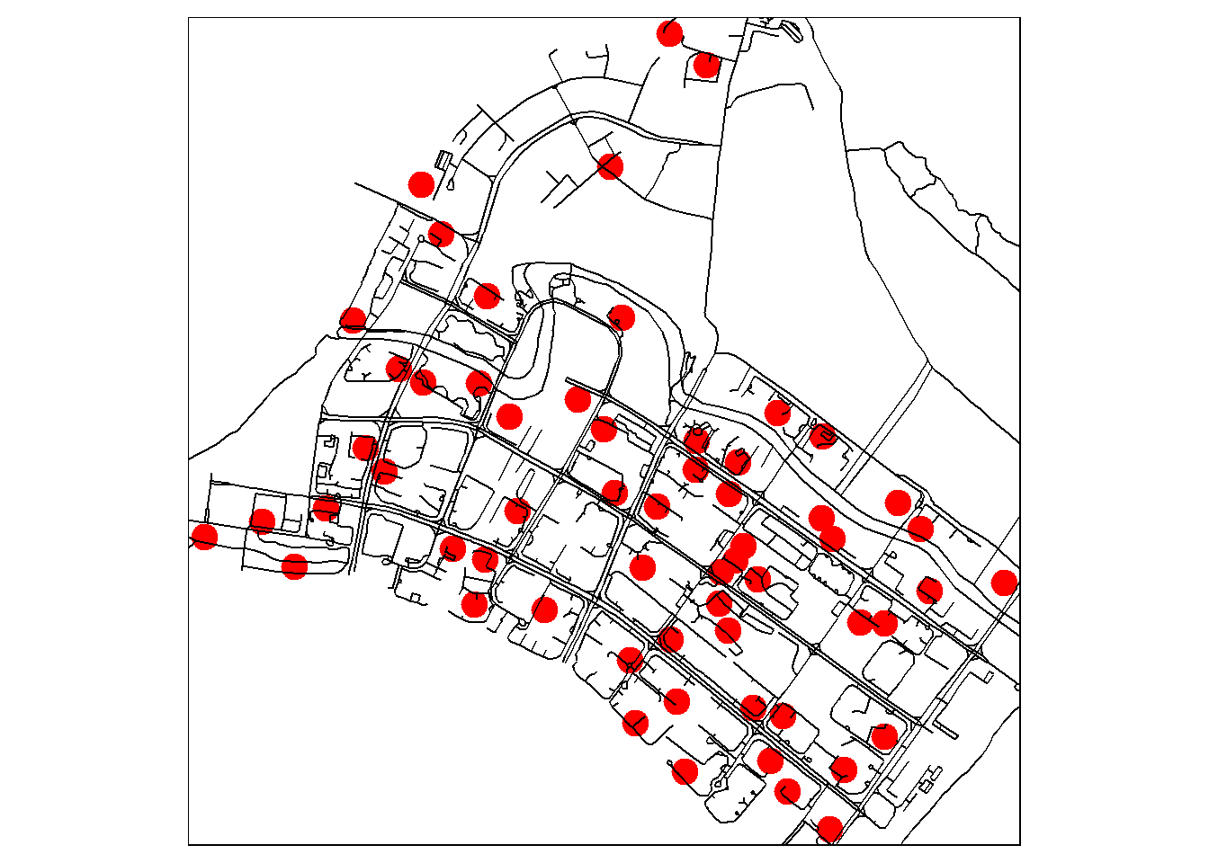 plot(childcare3414,add=T,col='red',pch = 19) ## 19 plot size, add = True is open plot or add the dot to the previous plot